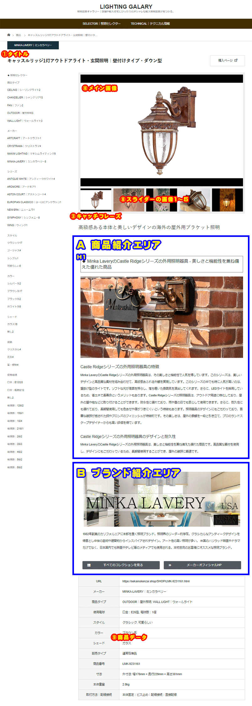 先ほどの編集で入力した「①タイトル」「⑩メイン画像」「⑧スライダー画像」「③キャッチフレーズ」「⑨商品データ」が表示されているはずです。