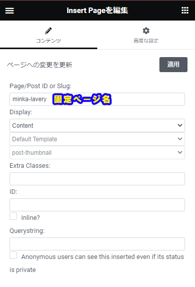こちらは予め作成された固定ページを表示するためのプラグイン”insert page”を設定します。編集でPage/Post ID or Slugを変更します。(入力名はこちらからお知らせします。)